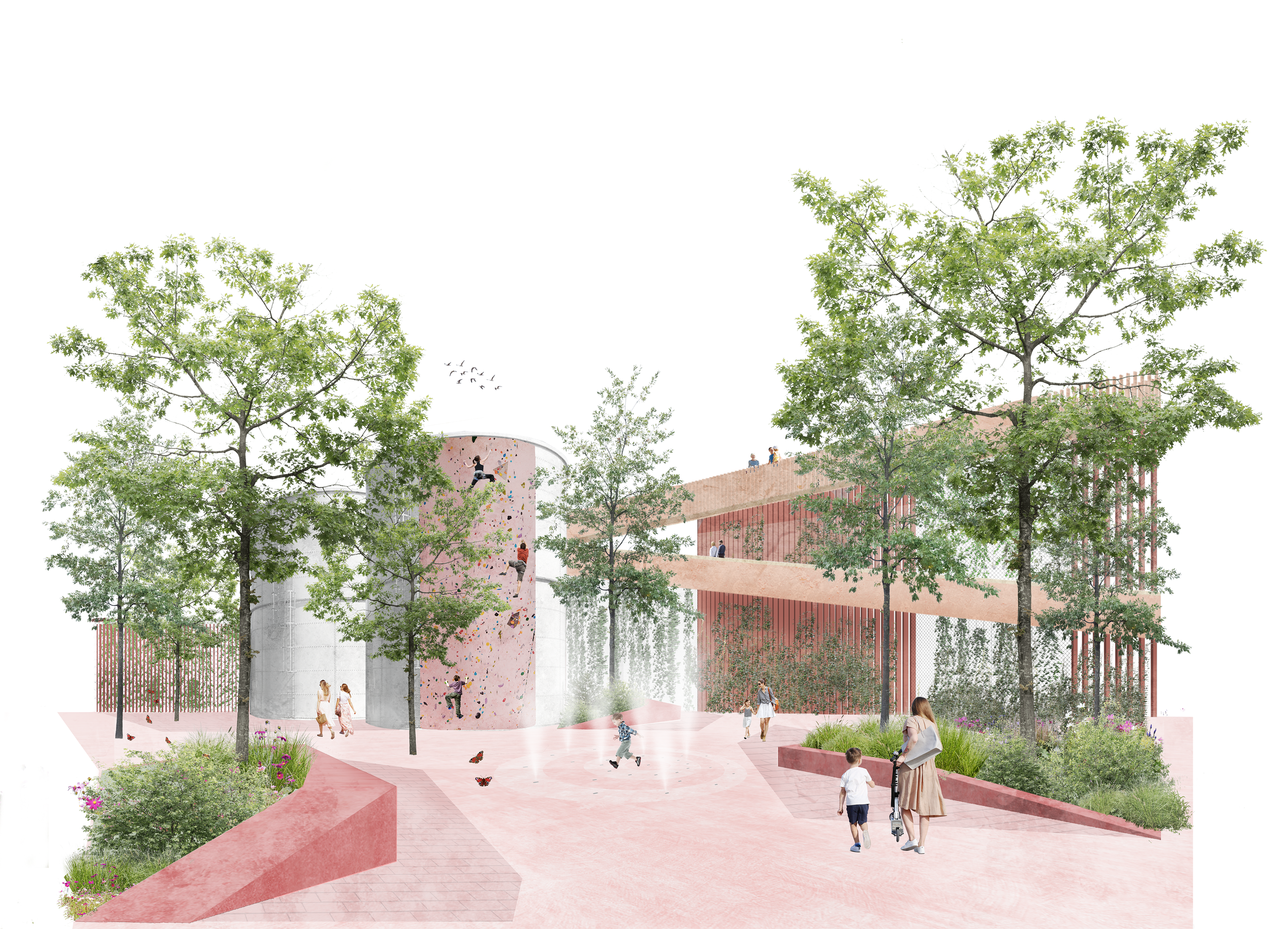 Stromy, rostliny, vertikální stěny a polopropustné povrchy utváří příjemné parkové náměstí. Prostor je součástí systému zelené infrastruktury a pomáhá k zlepšení klimatických podmínek areálu. Vodní prvek v dlažbě přispívá k ochlazování prostoru a stává se tak další hravou aktivní plochou.