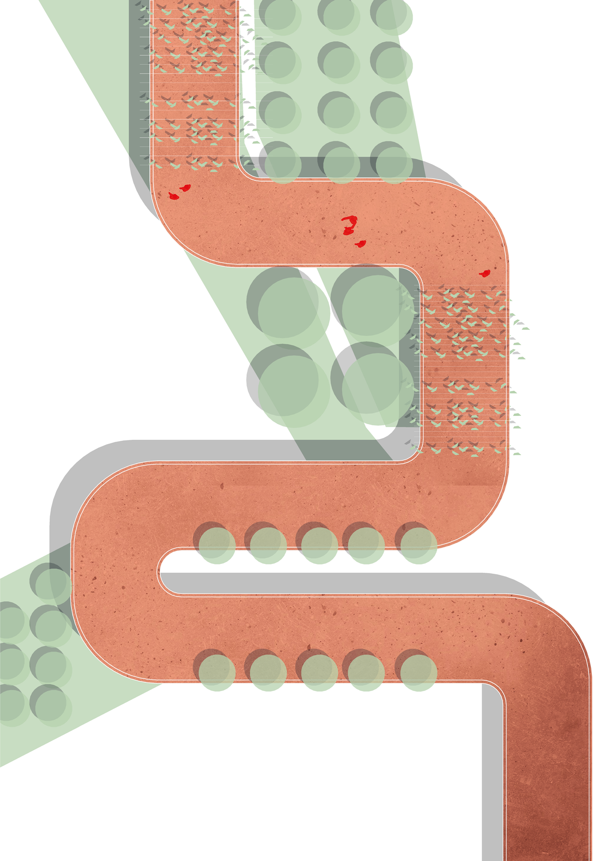 Pro návrh je stěžejní propojit různá měřítka, výškové úrovně, aktivity i zájmy návštěvníků. V místech průniku vrstev a měřítek navrhujeme budovy a prostranství jako pojítka, tak abychom tato spojení zpřístupnili a oživili.