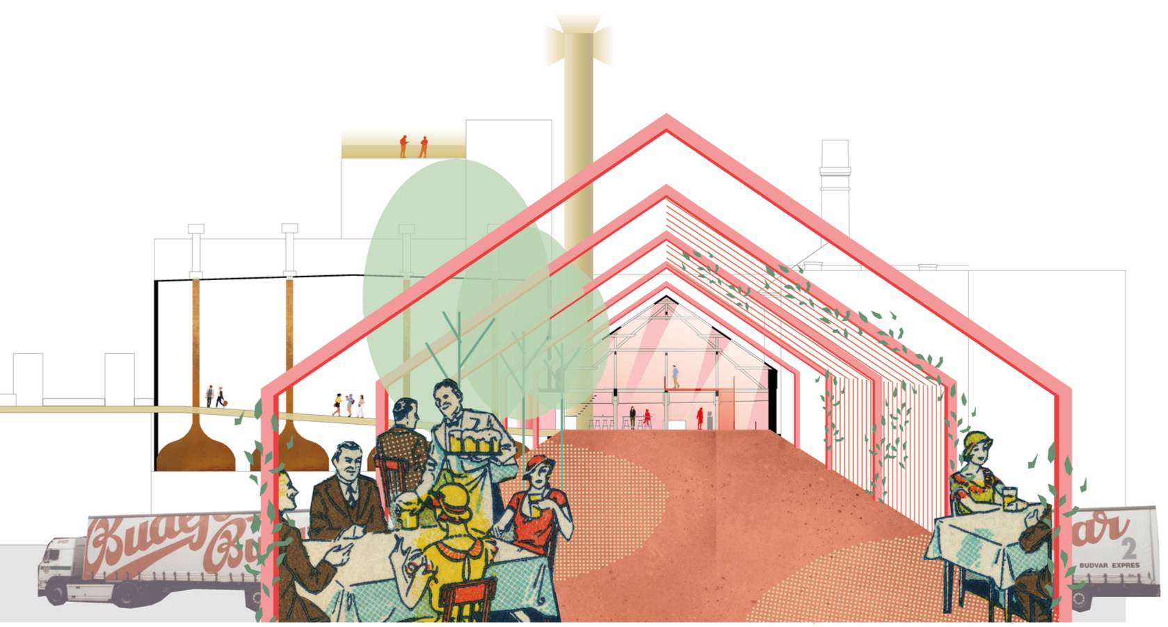 Naše řešení přináší jedinečné spojení historie a současnosti. Díky odvážnému prosklení se interiér otevírá do pivovarské zahrady a zalévá prostor přirozeným světlem. Koncept vertikálního propojení vás provede všemi patry – od historických sklepů, přes živé gastro provozy a skywalk, až po dechberoucí vyhlídku na střeše. Návštěvník tak získá nejen několik zážitků pod jednou střechou (pivovar, food hall, muzeum, pivnici), ale také možnost vnímat celý areál jako jeden harmonický a pulzující celek.