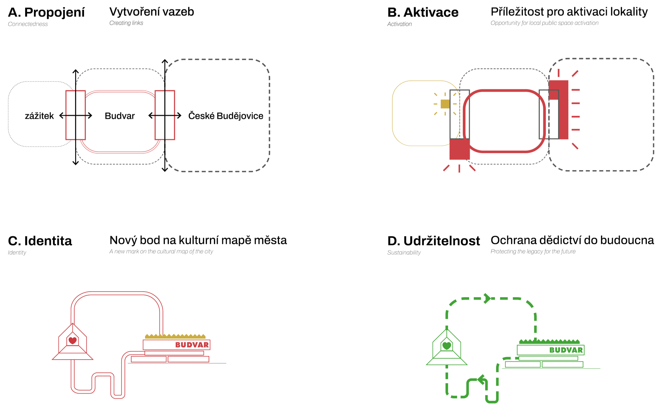Návrh silně pracuje s unikátní identitou, kterou podporuje. Každý si najde to své. Návrh podporuje lokální kulturu i značku Budvaru. Hledání identity nás dovedlo k potřebě propojení autentického srdce a racionální mozku - hlavního Hubu. Materiálově řešení skywalku je inspirováno unikátním Budějovickým pivem. Otevřená sladovna je autentickým historickým srdcem areálu. Charakteristická věž vyhlídky viditelná z širšího okolí láká návštěvníky k návštěvě.